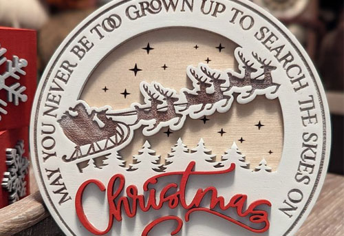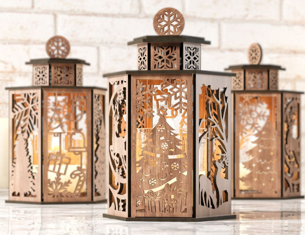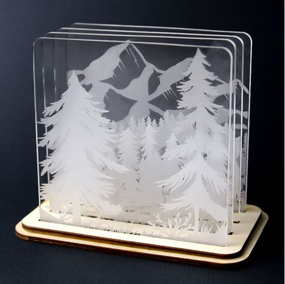 Design layered wooden lightboxes featuring winter landscapes, Christmas trees, or holiday greetings. LED lighting brings the engravings to life.