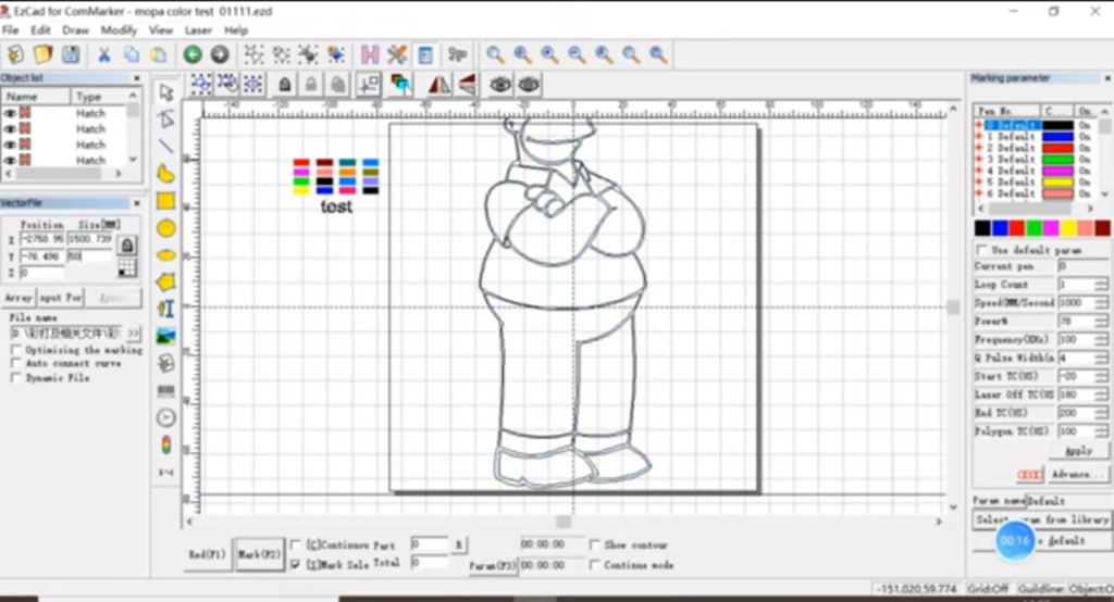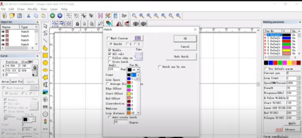 Designing is what makes your project stand out from others. It reflects your taste and view which is why it is a crucial step that needs precision and creativity. If you are making a new project design or utilizing the premade layout, see for yourself that it must be compatible with the material and the resolution of the Mopa machine. According to the corresponding parameters of the selected color (speed, power, pulse width, frequency, interval, number of passes), fill the corresponding area. Ensure that the parameters of the corresponding color are completely consistent with the parameters of the corresponding color in the test file.