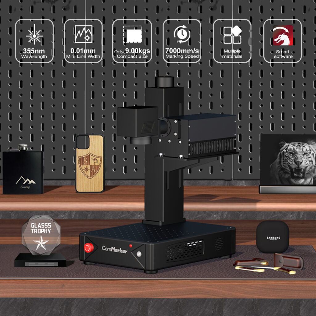 آلة الوسم بالليزر UV من ComMarker 📜معلمات المواصفات: تبريد الهواء, قوة: 3حجم ث/5 واط:350×650x720 ملم(13.78×25.59×28.35بوصة), عدسة: 110ملم × 110 ملم(6.89×6.89بوصة), وزن: 50.71 رطل(23كلغ) 🤖ليزر ComMarker UV