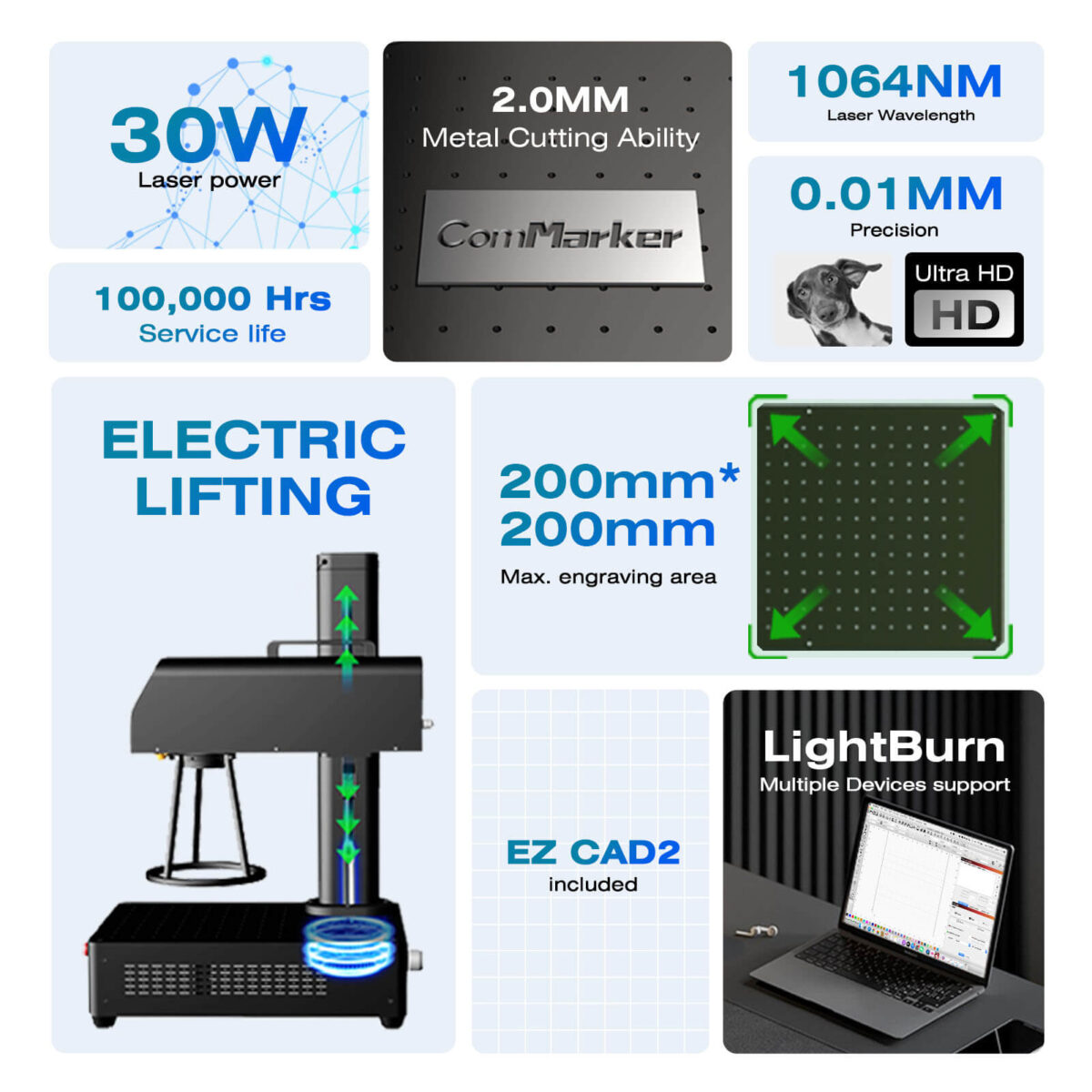 آلة النقش بليزر الألياف ComMarker B4 30W متعددة الاستخدامات, قادرة على نقش مجموعة واسعة من المواد, بما في ذلك المعادن, البلاستيك الصلب, حجر, جلد, و اكثر. هذه القدرة على التكيف تجعلها أداة قوية لمختلف الصناعات, توفير نتائج عالية الجودة بدقة.