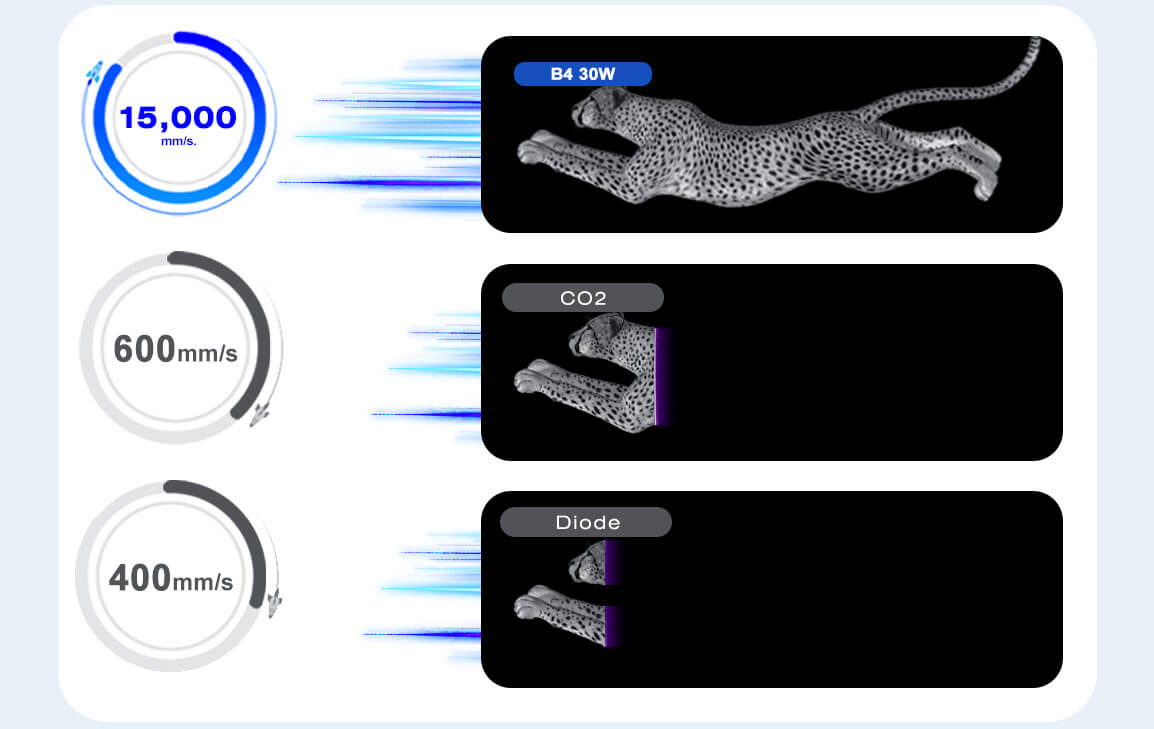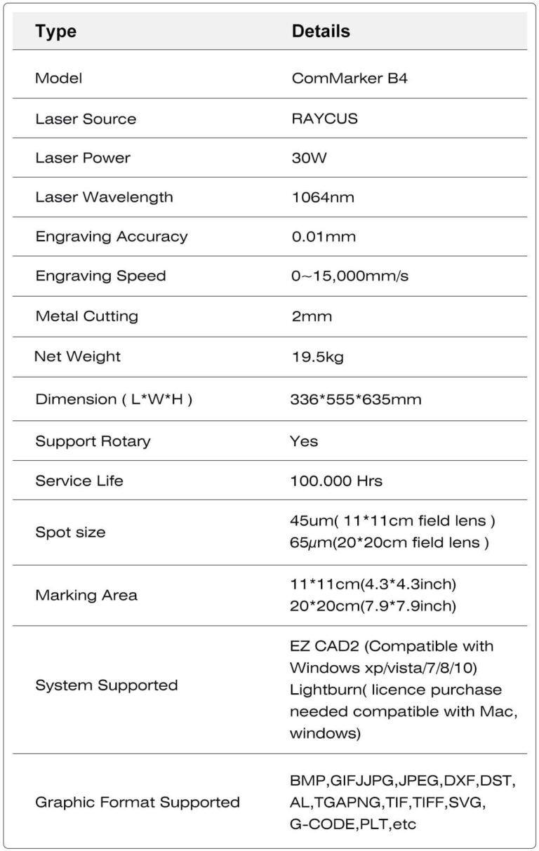 يوفر B4 30W 4.3×4.3 بوصة (110×110 مم) و 7.8×7.8 بوصة (200×200 مم) مجال لمختلف أحجام المشاريع. تتوفر عدسات إضافية تتراوح من 70 مم إلى 200 مم عند الطلب لتلبية احتياجات النقش المختلفة.