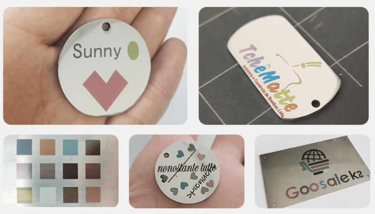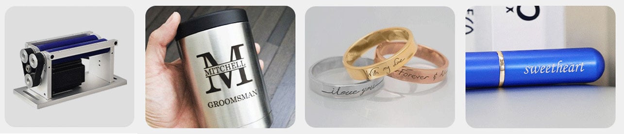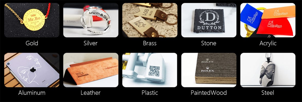 يمكن لآلة الوسم بليزر الألياف B4 MOPA 60W نقش معادن مختلفة مثل الذهب, الألومنيوم (مع تأثير اللون الداكن), الفولاذ المقاوم للصدأ (بألوان متعددة), البلاتين, فضة, التيتانيوم, وغيرها. كما أنه يعمل على المواد البلاستيكية مثل ABS, الكمبيوتر, جيش التحرير الشعبى الصينى, السيليكون, و بي بي تي.