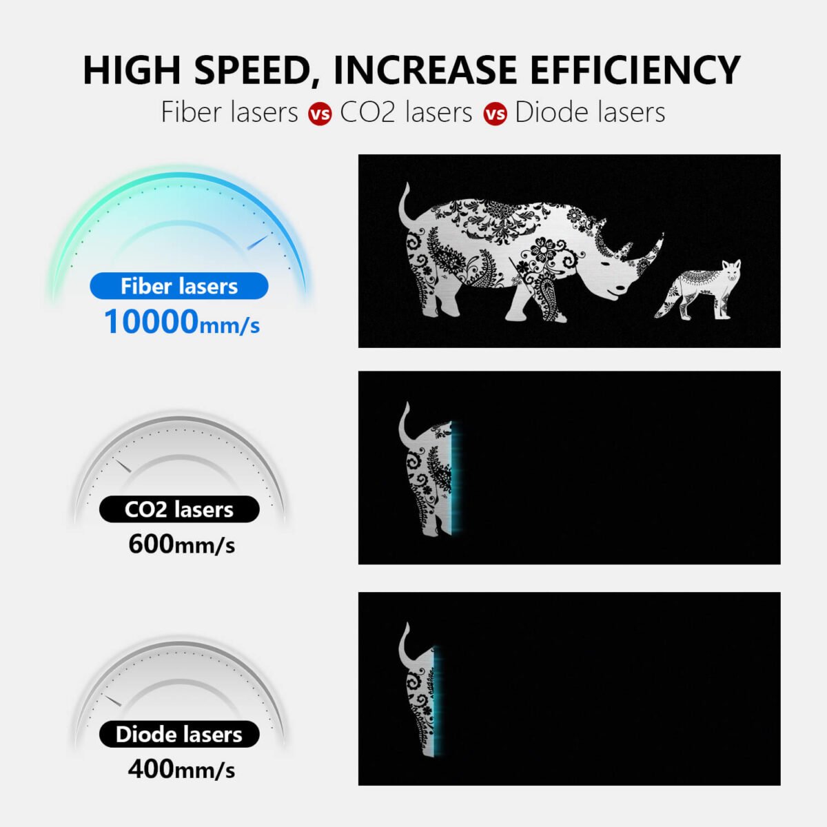 تتيح ألياف MOPA وضع علامات ألوان نابضة بالحياة على الفولاذ المقاوم للصدأ والنقش عالي التباين على الألومنيوم المؤكسد. لا يقتصر الأمر على أنها تتميز بسرعة تصل إلى 10000 مم / ثانية فقط,ولكنه يوفر أيضًا دقة عالية 0. 01مم.
