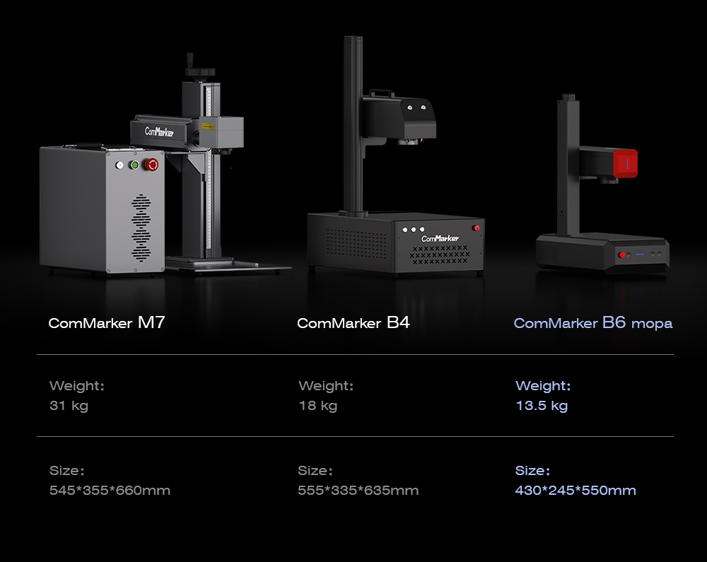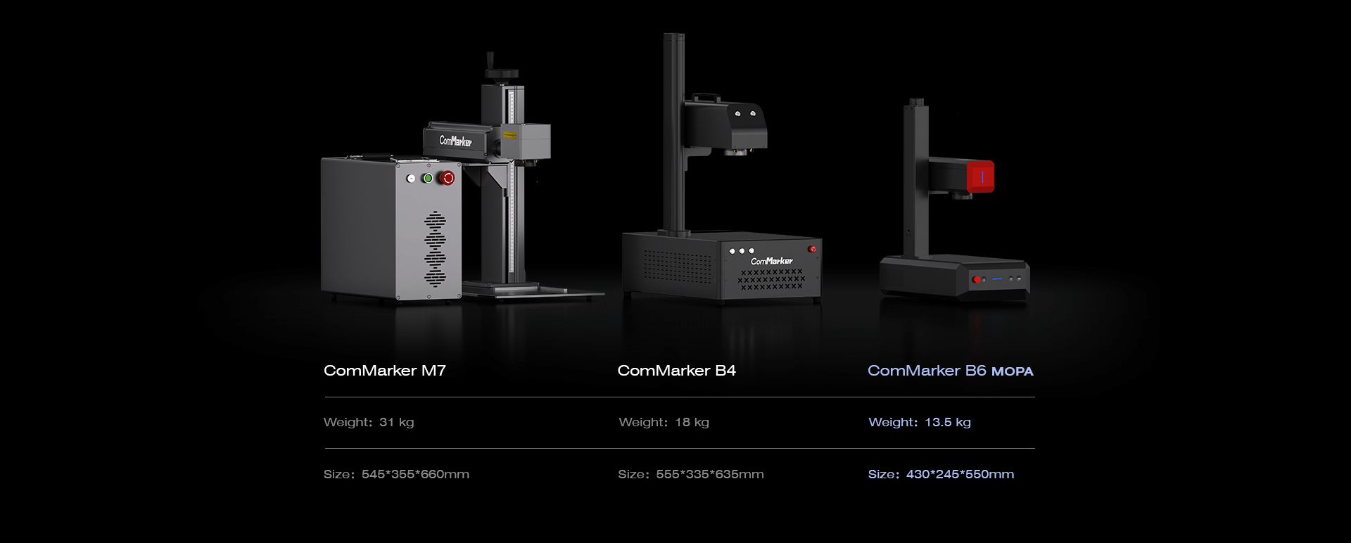 وزنها في فقط 13.5 كلغ (29.7 رطل), ComMarker B6 هي أصغر آلة ليزر ألياف من الدرجة الصناعية