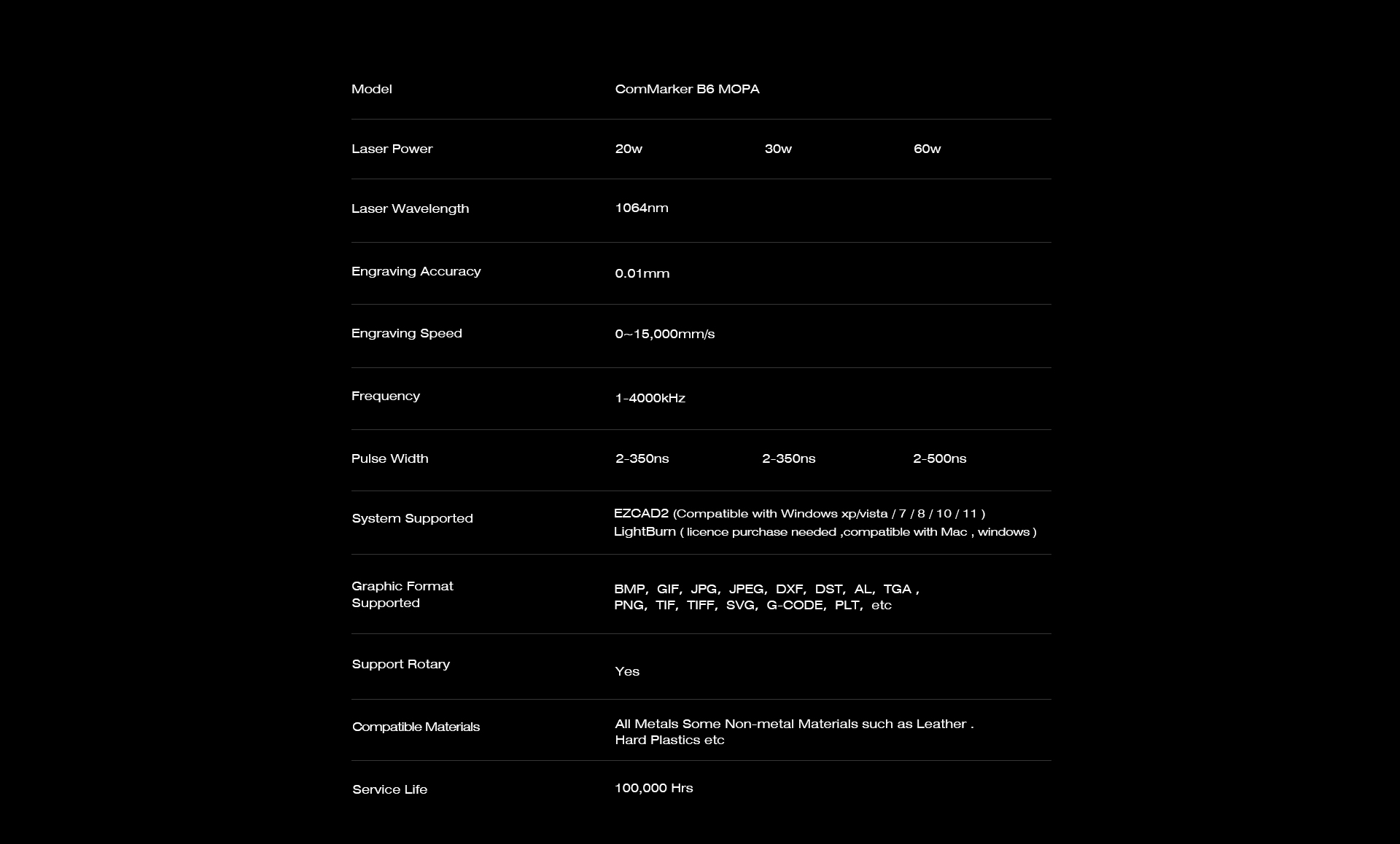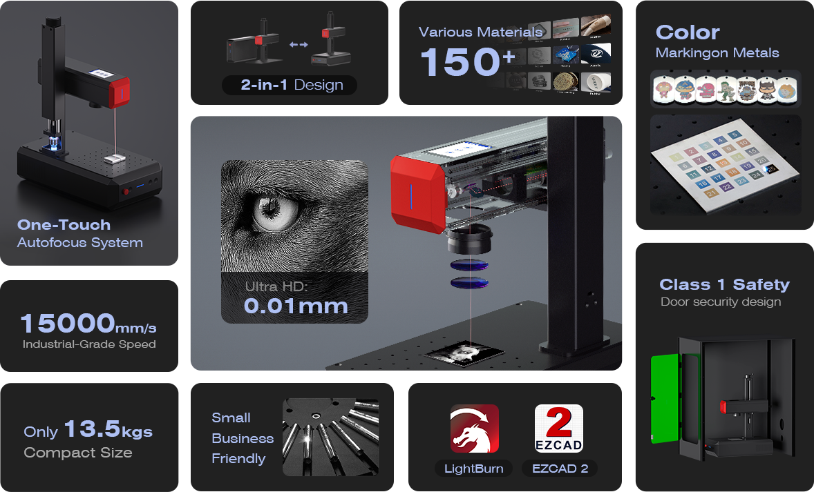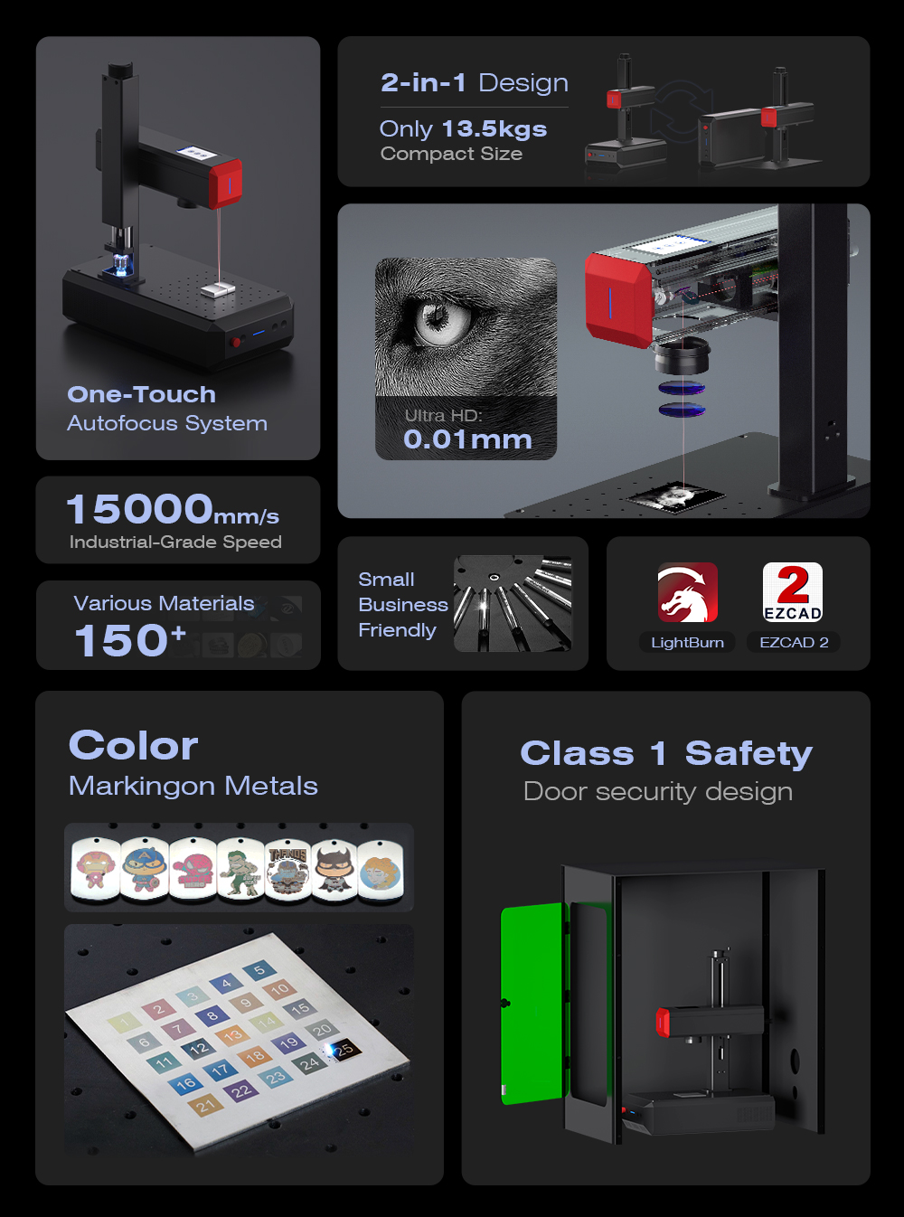 يتميز جهاز ComMarker B6 المدمج بتركيز تلقائي رائع وقدرات محسنة, بما في ذلك نطاق تردد أوسع وإعدادات عرض النبض للحصول على ألوان متناسقة على الفولاذ المقاوم للصدأ. مع ماكينة نقش ألياف الليزر B6 60W MOPA, يمكنك استكشاف مجموعة واسعة من المواد والبلاستيك, فتح إمكانيات إبداعية لا نهاية لها!