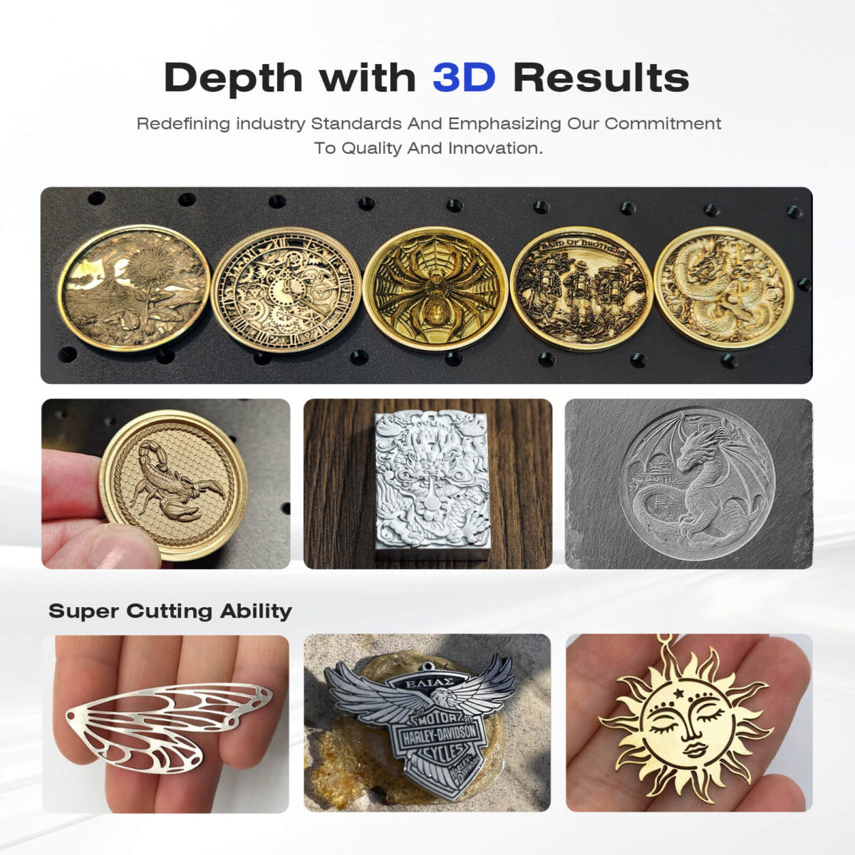 *تتطلب مساحة النقش مقاس 300 × 300 مم طاقة أعلى لتحقيق أفضل النتائج. 60يوصى باستخدام W MOPA لتحقيق تأثير النقش المطلوب