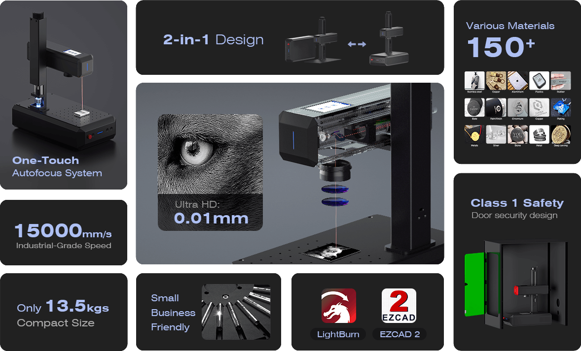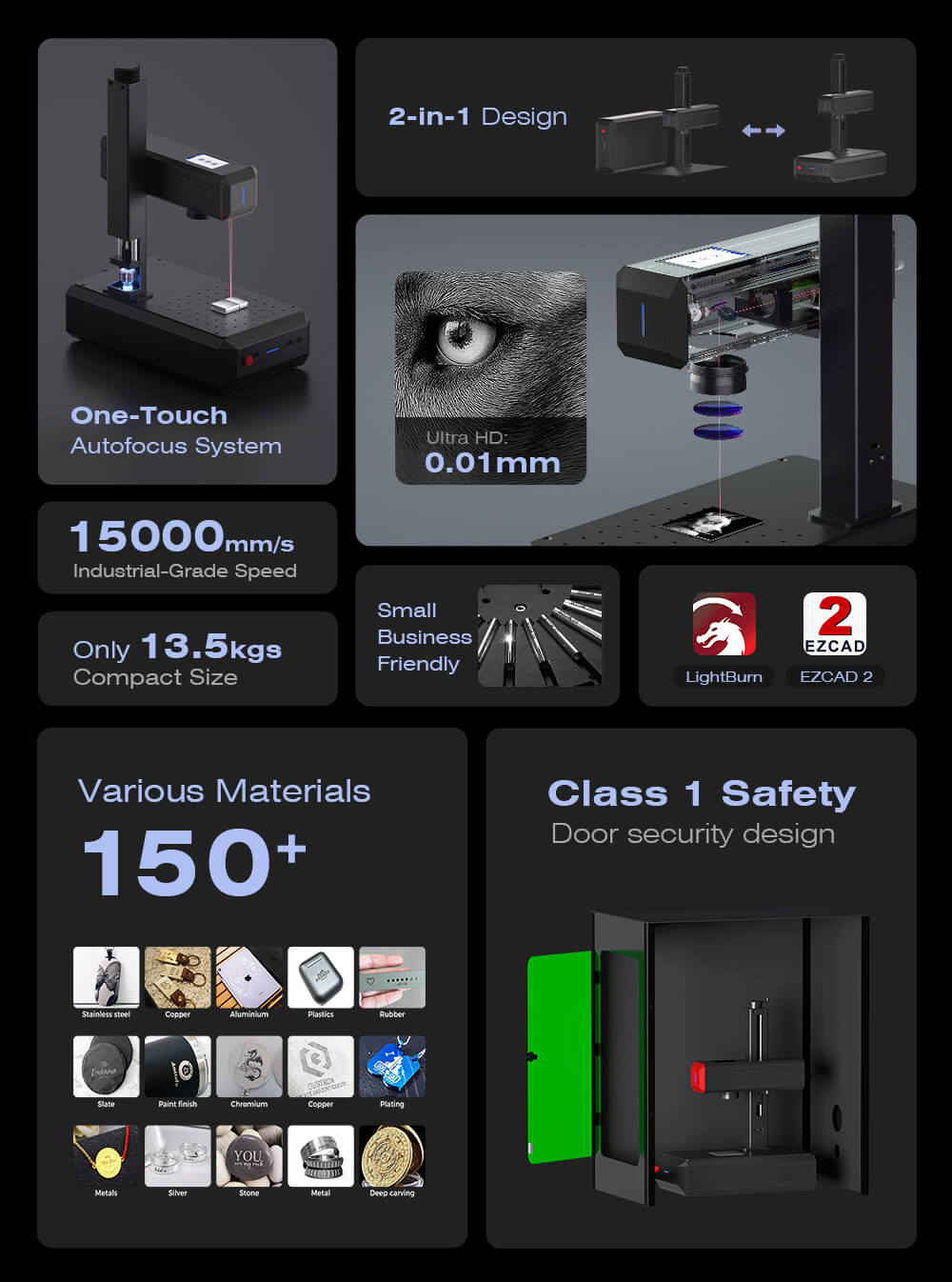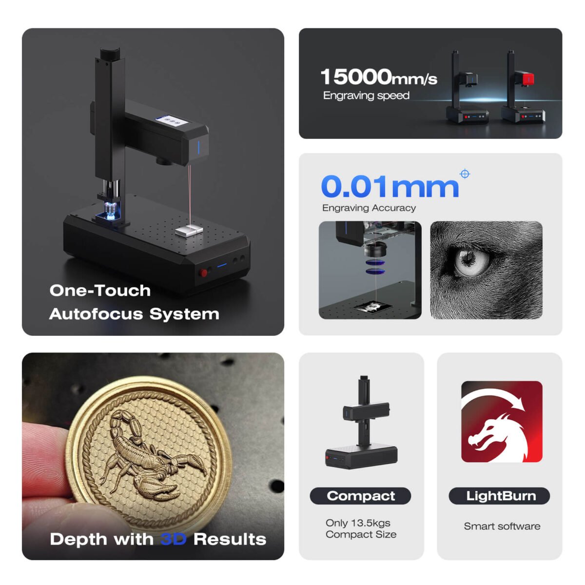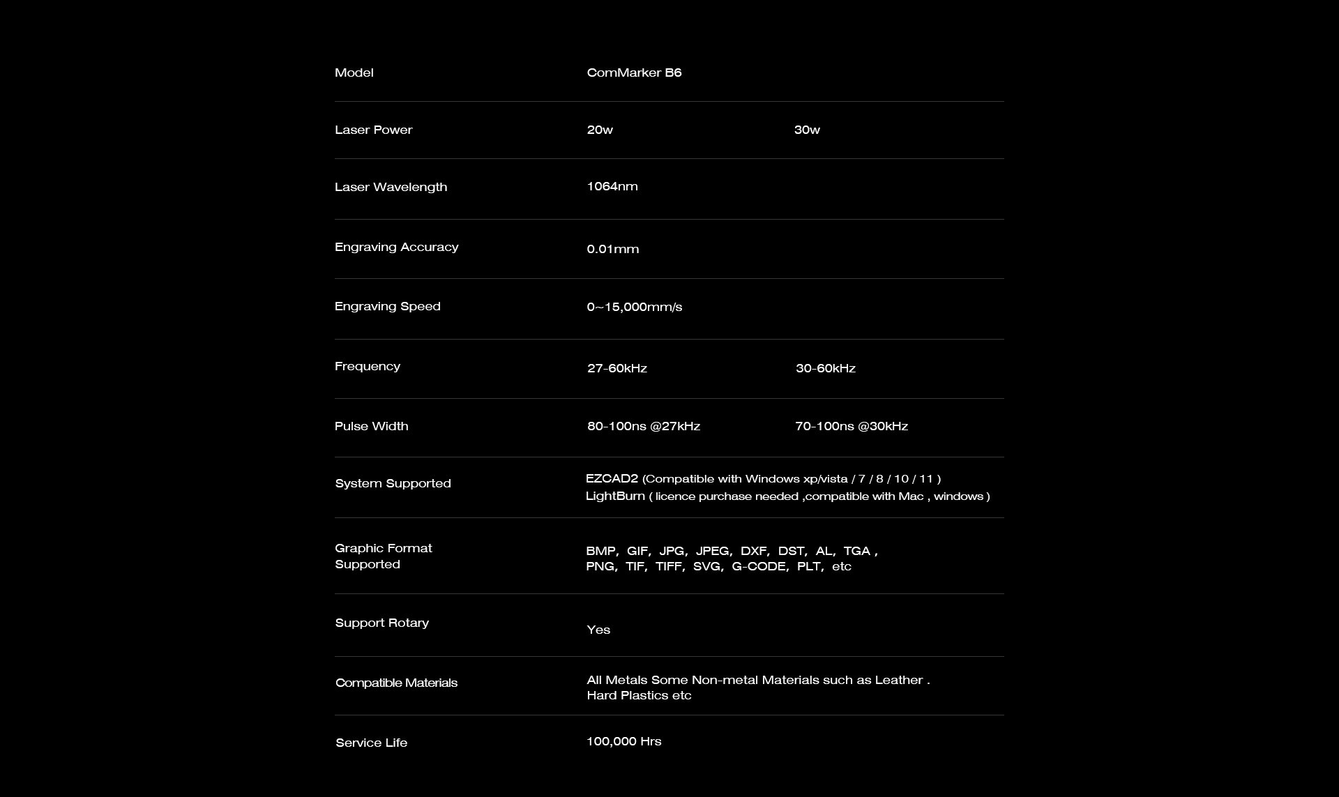 يتميز جهاز ComMarker B6 المدمج بتركيز تلقائي رائع وقدرات محسنة, بما في ذلك نطاق تردد أوسع وإعدادات عرض النبض للحصول على ألوان متناسقة على الفولاذ المقاوم للصدأ. مع ماكينة نقش ألياف الليزر B6 60W MOPA, يمكنك استكشاف مجموعة واسعة من المواد والبلاستيك, فتح إمكانيات إبداعية لا نهاية لها!