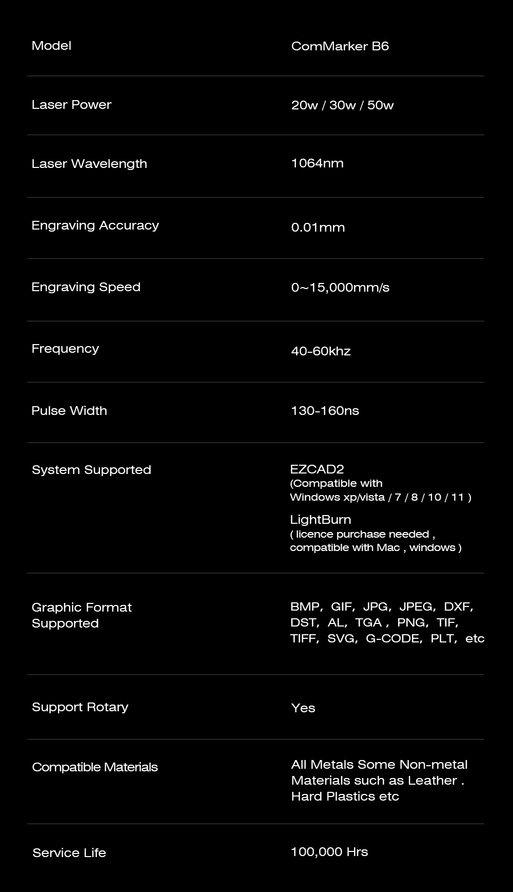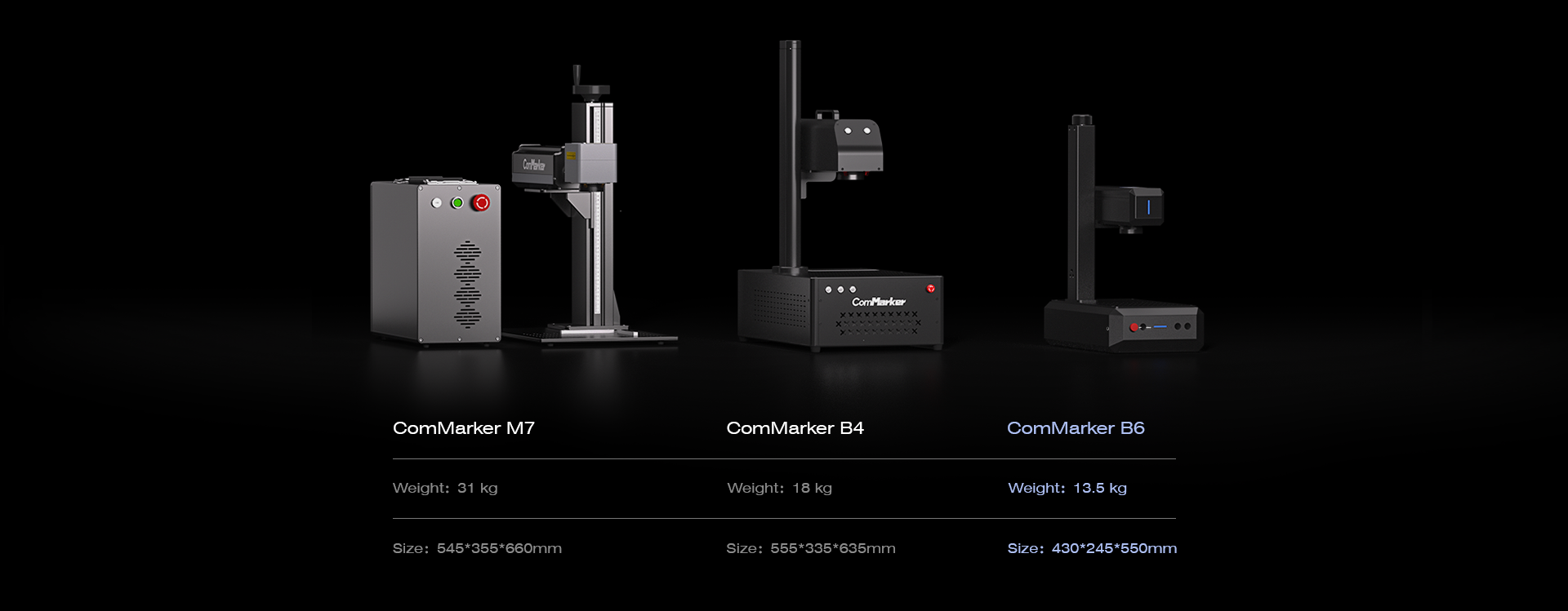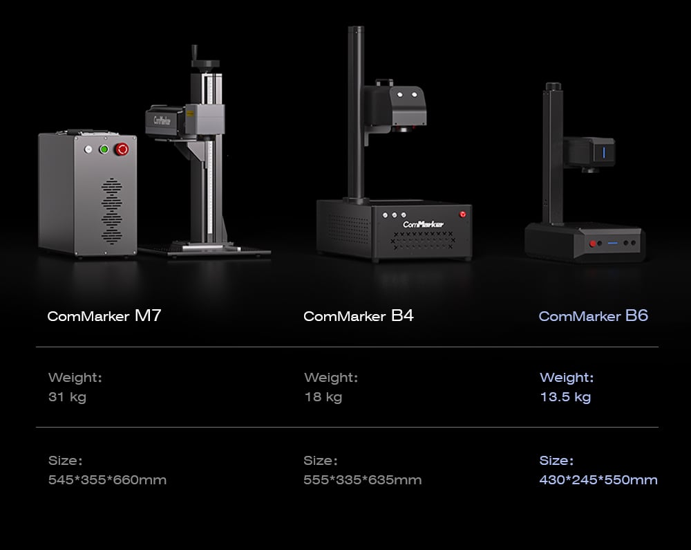 وزنها في فقط 13.5 كلغ (29.7 رطل), ComMarker B6 هي أصغر آلة ليزر ألياف من الدرجة الصناعية