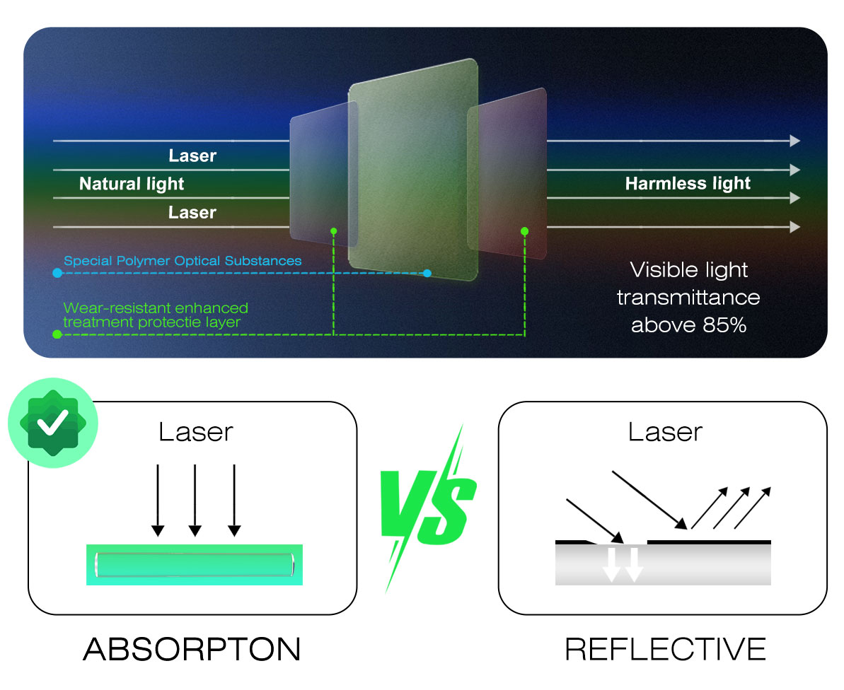 مزايا الامتصاص مصدر الضوء ليس انتقائيا, أنت تستطيعحماية بأمان مجموعة متنوعة من الضوء المنتشر; المعدل التوهين مرتفع;ارتداء أو مسيل للدموع, حتى لو كان هناك خدشلا يؤثر على ضوء الأمن;وقت رد فعل سريع للضوء:0.000000001ثواني;