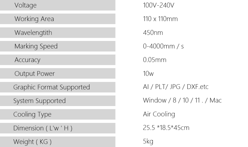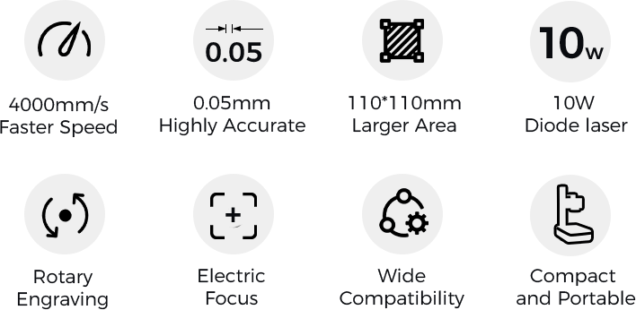 مساحة عمل كبيرة 110*110 مللي متر, مما جعل Q1 جهازًا احترافيًا ومتعدد الاستخدامات ويثق به الهواة, الفنانين, شركات التصنيع الصغيرة, والنقاشون المحترفون. فهو يوفر سرعة أعلى, دقة, جودة, والكفاءة من أي منزل الحالي حفارة الليزر.