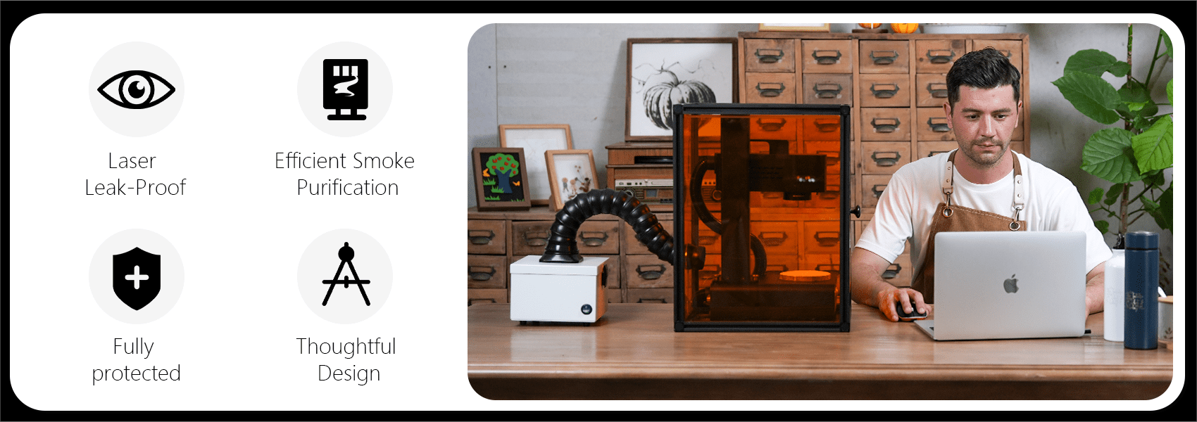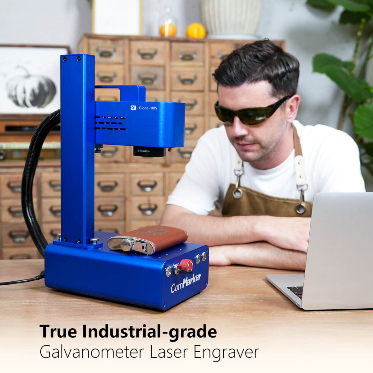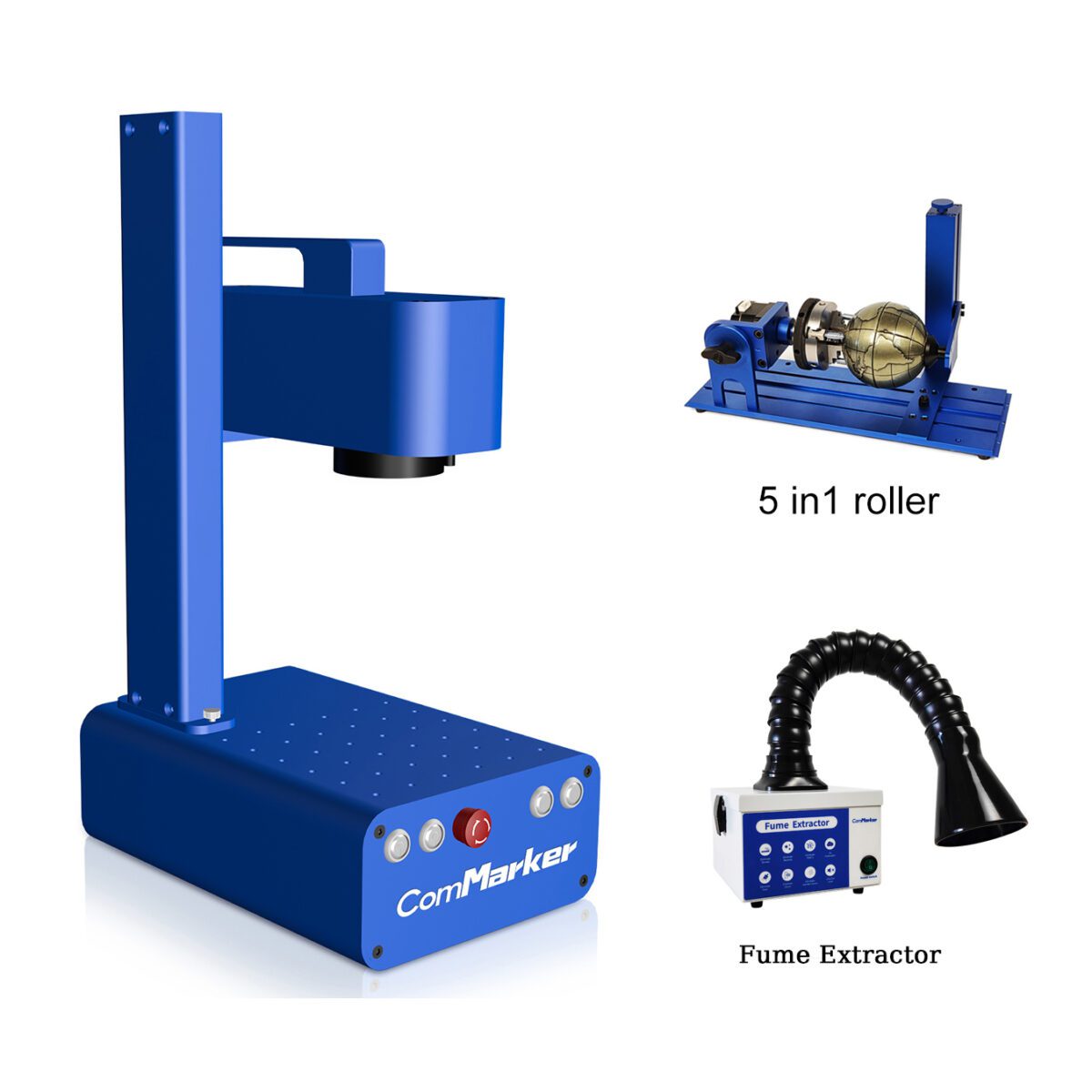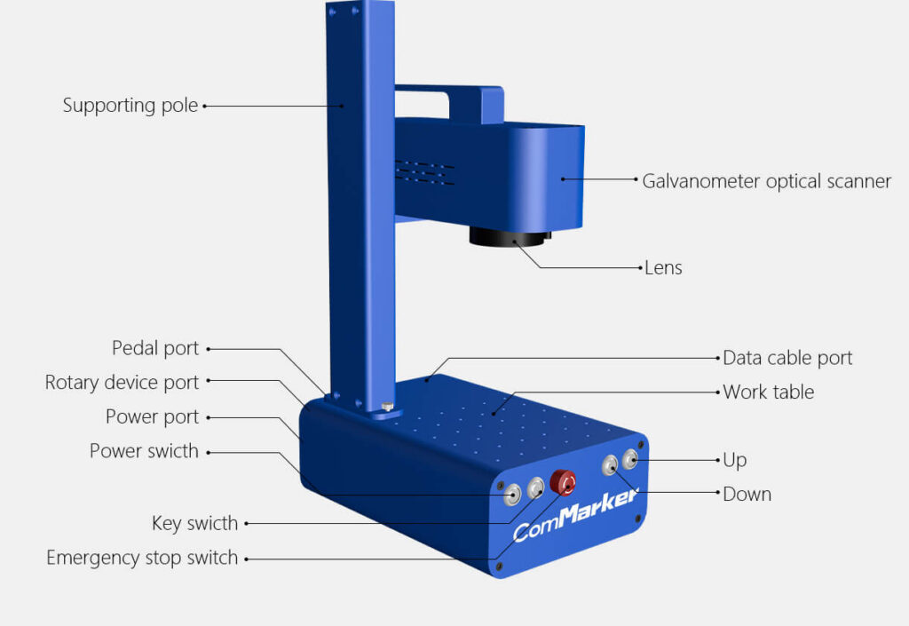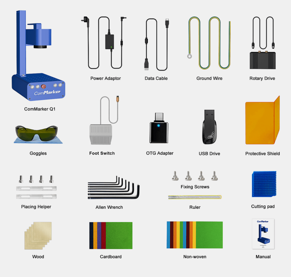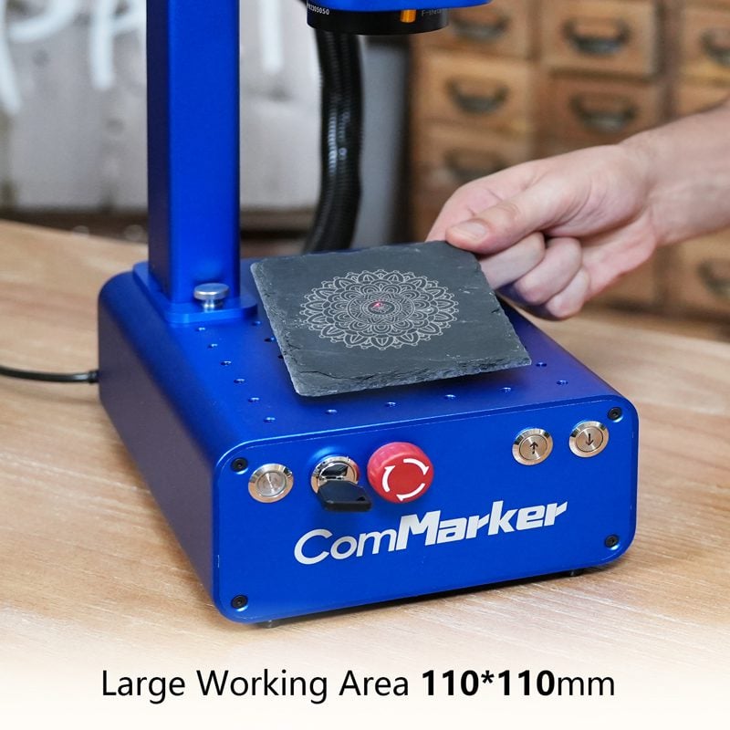 تلتزم شركة ComMarker Q1 تمامًا بسلامتك. وقد تم تصميم الجهاز بوظيفة توقف طوارئ عالية المستوى ويأتي مع نظارات أمان عالية الجودة ودرع واقي لحماية عينيك.