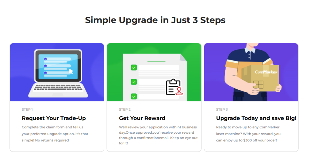 Le Programme d'échange ComMarker permet aux utilisateurs de mettre à niveau leurs machines de gravure laser et de bénéficier de réductions allant jusqu'à $300 sur les nouveaux modèles, sans retourner leur machine actuelle. Cette approche soutient les pratiques respectueuses de l'environnement en minimisant les déchets industriels et en encourageant les mises à niveau responsables.. Conçu pour les professionnels et les amateurs, le programme offre des économies importantes sur la dernière technologie de ComMarker.