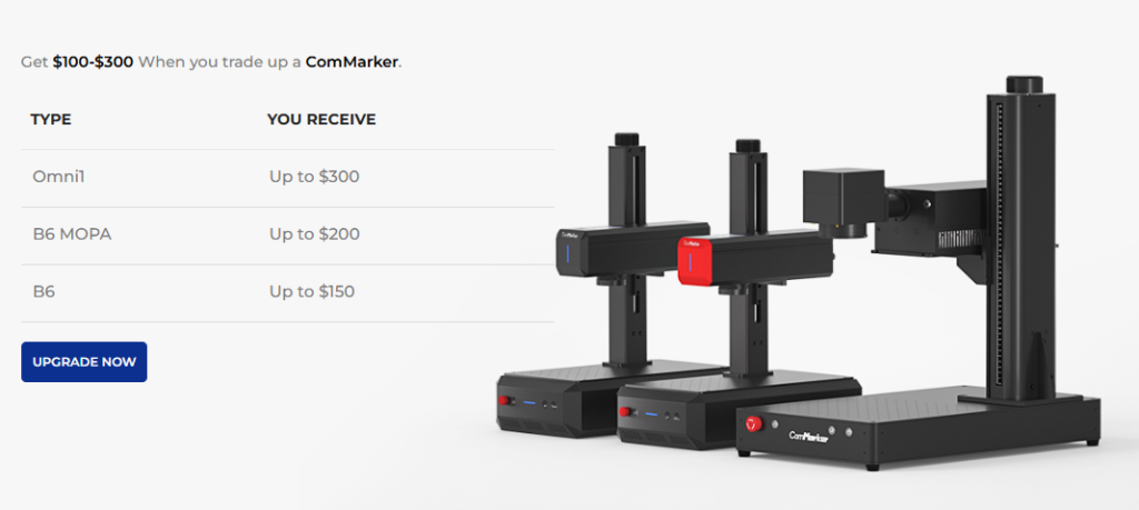 Le programme ComMarker Trade Up est conçu pour rendre la mise à niveau accessible et durable.. Avec jusqu'à $300 en économies et en fonctionnalités haut de gamme, il n'y a pas de meilleur moment pour améliorer votre configuration de gravure. Commencez le processus aujourd'hui, et investissez dans des équipements qui soutiennent à la fois vos objectifs commerciaux et un avenir plus vert.