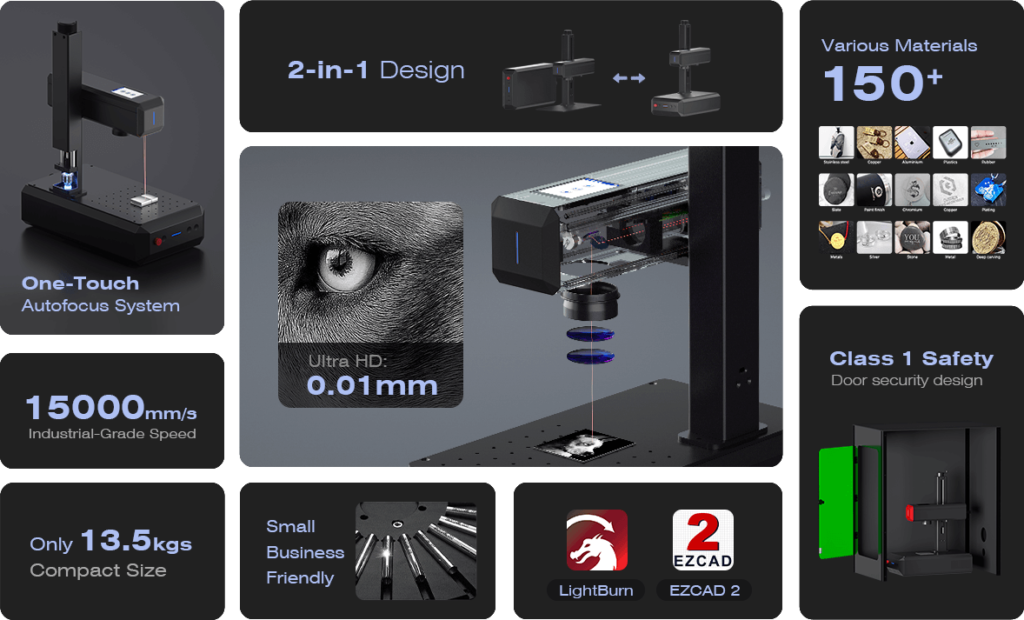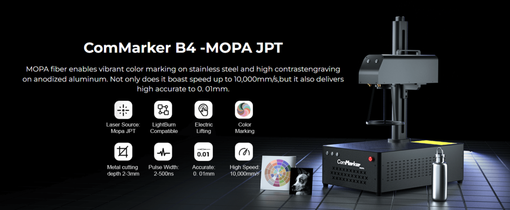 B4를 기반으로합니다, B4 MoPA에는 60W JPT MOPA 레이저가 있습니다, 알루미늄의 스테인레스 스틸 및 검은 색/흰색에서 생생한 색상 표시 활성화. 0.01mm 정확도로 최대 2mm 금속을 줄일 수 있습니다.. 이 기계에는 자동 초점을위한 전기 리프트가 포함되어 있으며 소형 설계를 유지 관리합니다. (22 kg). 컬러 메탈 마킹 또는 더 깊은 컷이 필요한 제조업체 및 소규모 제조업체에 적합합니다.