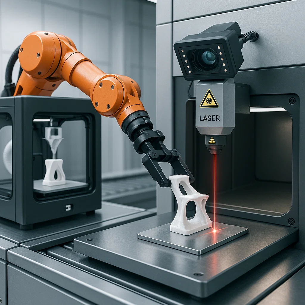 향후 하이브리드 제조 라인에는 3D 프린터에서 레이저 스테이션으로 직접 인쇄 된 부품을 전송하는 로봇 암이 있습니다.. 비전 시스템은 정렬을 확인할 수 있습니다, 자동 초점 조정을 트리거합니다, 그리고 조각 품질을 실시간으로 검사합니다.