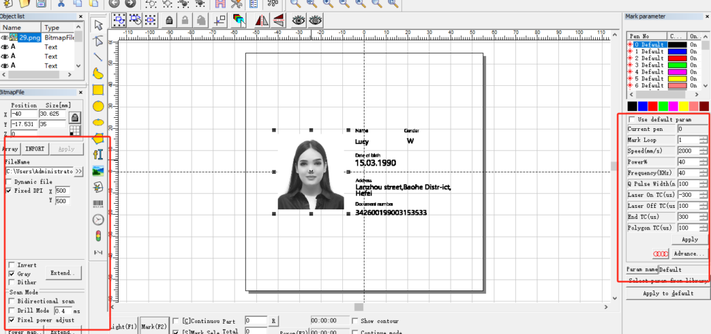 The laser’s settings—speed, makt, Frekvens, and focus—can be adjusted based on the type of plastic and the level of detail you want to achieve.