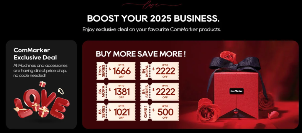 This Valentine’s Day, take advantage of our exclusive offer to enhance your creative projects or business operations. Whether you’re looking to start a new venture or upgrade your existing equipment, ComMarker’s laser engravers provide the reliability and performance you need to succeed.