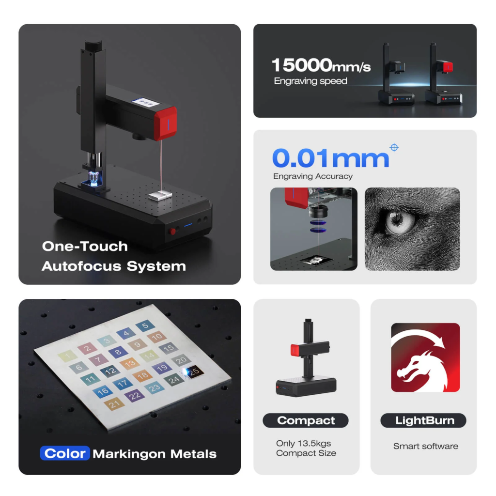 Velkommen til æraen med smart fargegravering. Rekordstor kompakt størrelse fargemarkingsevne super 3D-gravering & Skjæreevne 2-i-1 design Auto-Focus Technology 15.000mm/s Speedmax ™ Gravering 8K HD Nøyaktighet Smart LED-berøringsskjerm