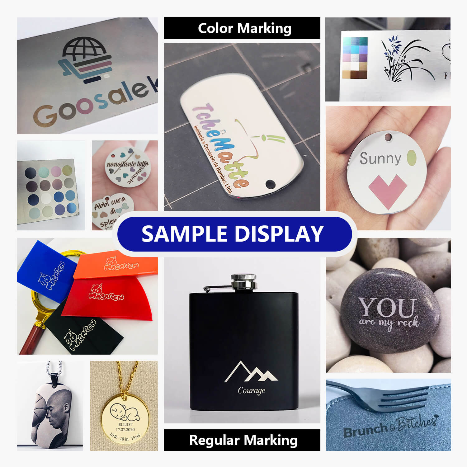 The B4 MOPA 20W Fiber Laser Engraving Machine can engrave a variety of metals, including gold, aluminum (with dark color effect), stainless steel (in multiple colors), platinum, silver, titanium, brass, tungsten, carbide, nickel, carbon steel, chrome, copper, iron, and others. It also works well on plastics such as ABS, PC, PLA, silicon, and PBT with a low rate of melting or burn.