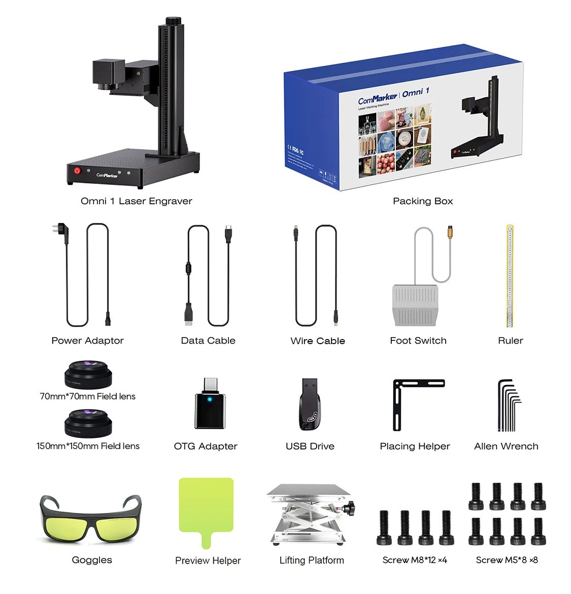 Omni 1 comes with two lenses, 70mm*70mm lens and 150mm*150mm lens.