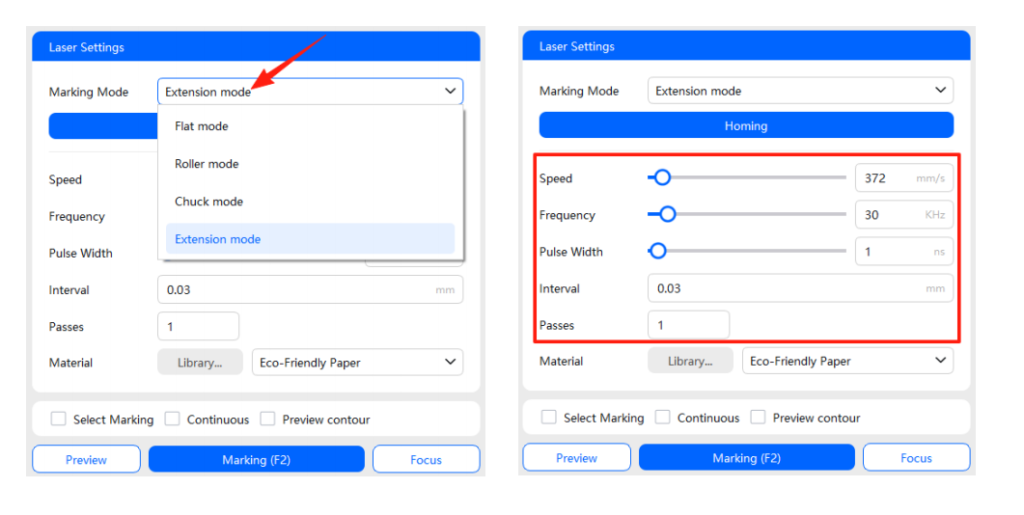 In the bottom-right corner of the laser software UI, select “Extension Mode.”