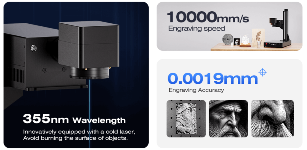 Laser UV use a much shorter wavelength than CO2 or fiber lasers (em volta 355 nm), making them ideal for marking plastics, vidro, e cerâmica. UV lasers generate less heat, which helps prevent material deformation, making them perfect for delicate materials that might otherwise crack or burn.