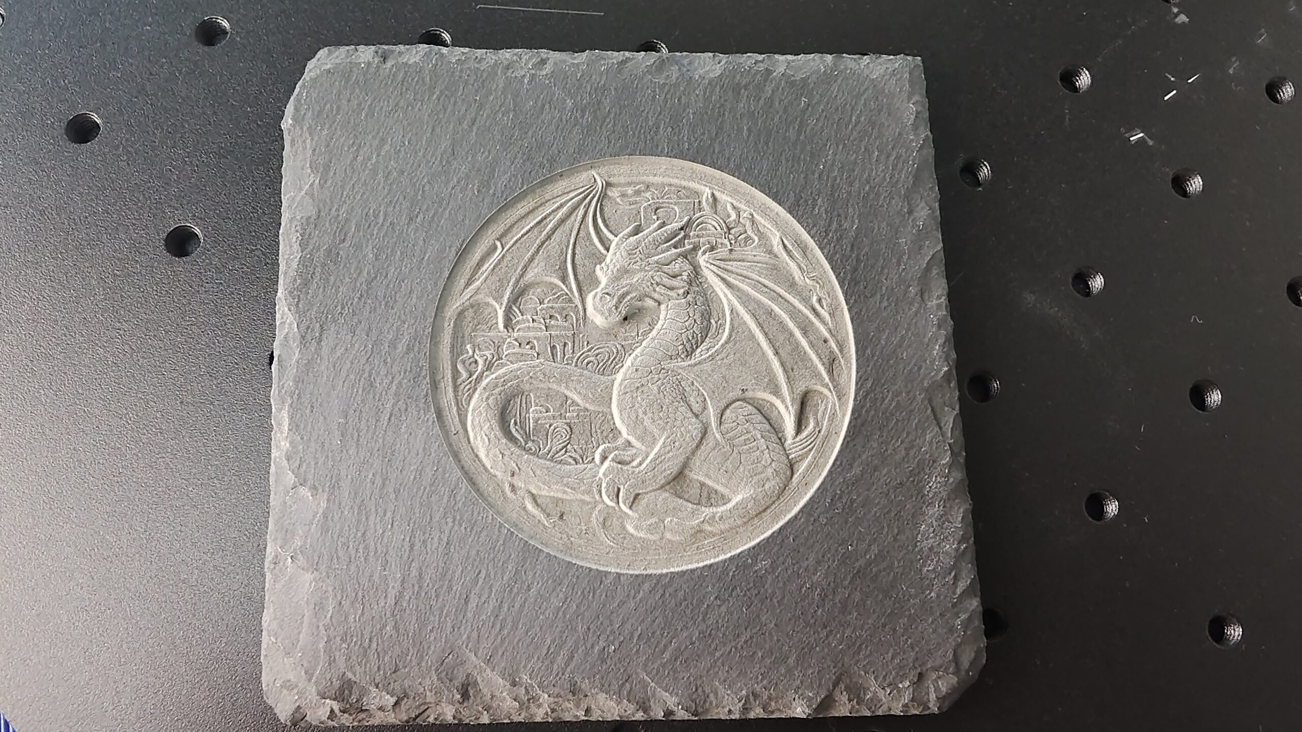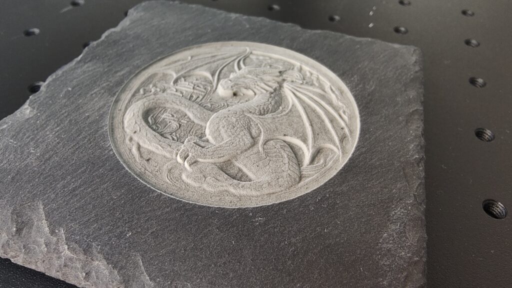 Sırada raster gravür var, temel olarak dijital görüntülerin istenilen taş üzerine kazınmış bir dizi dosta dönüştürülmesi içindir. Bu aynı zamanda resimde gösterilen dokuyu oluşturmak için de kullanılır..