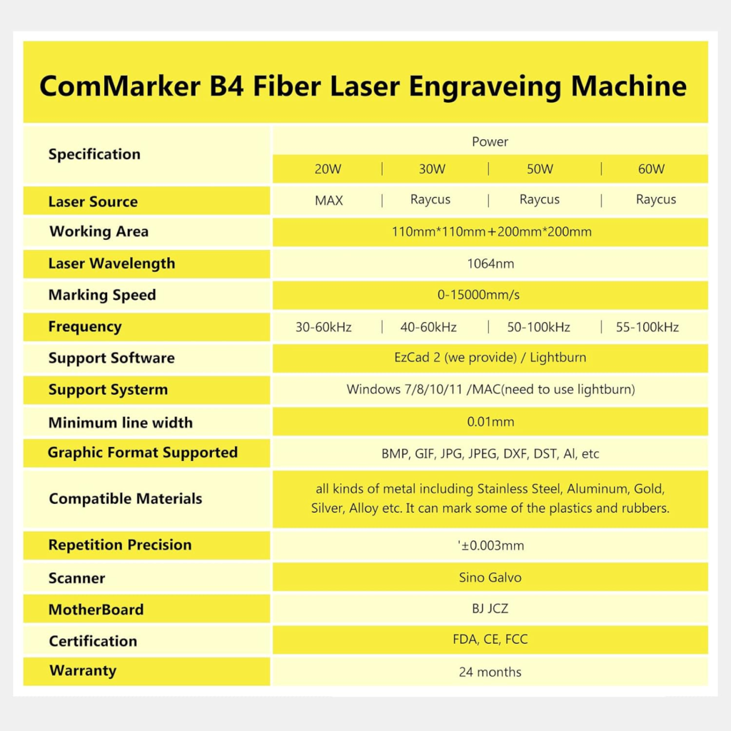 Bu fiber lazer gravür makinesinin özel uygulamalarına geçmeden önce, ComMarker B4'ün temel özelliklerini ve spesifikasyonlarını inceleyelim:
