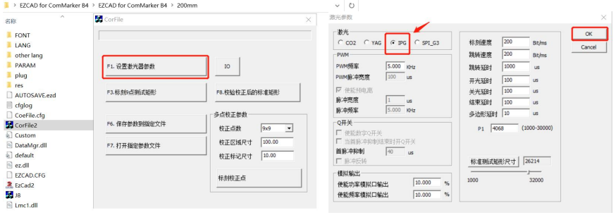 - 单击“F1”, 设置激光源参数, 选择“IPG”并单击“确定”.