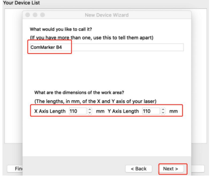 8.如有必要,更改名称, 根据镜头输入正确的X和Y轴长度. 点击“下一步”