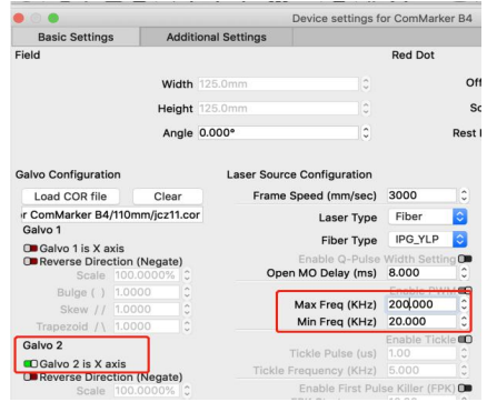 12.更改频率设置“Min 20”, “最多 200 个”. 打开“振镜2”. 并且已准备好使用 Lightburn 控制机器。*(请参考步骤 11 MOPA机用)