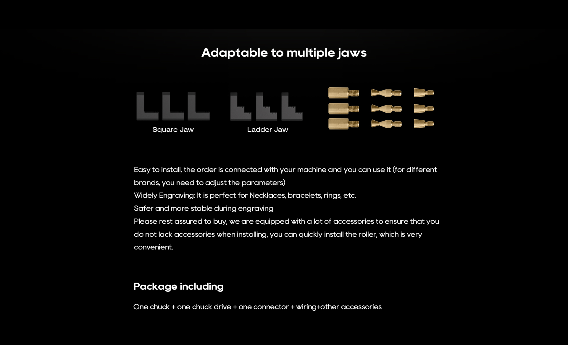 - 套餐包括 : 一个夹头 + 一个卡盘驱动 + 一个连接器 + 接线+其他配件